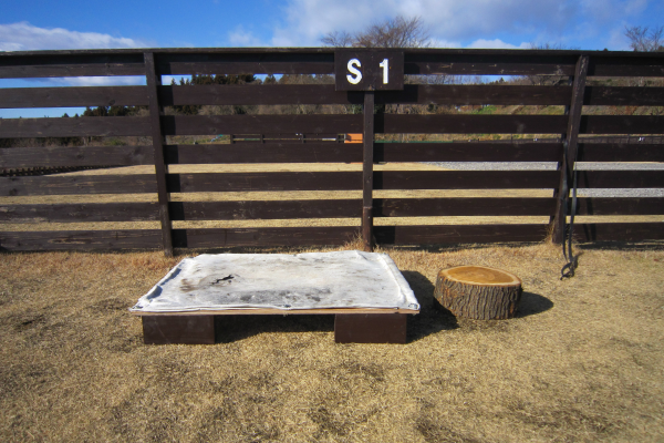 ★薪割りの際は薪割り台をご利用ください。(芝生防護板の右にあるが薪割り台です)